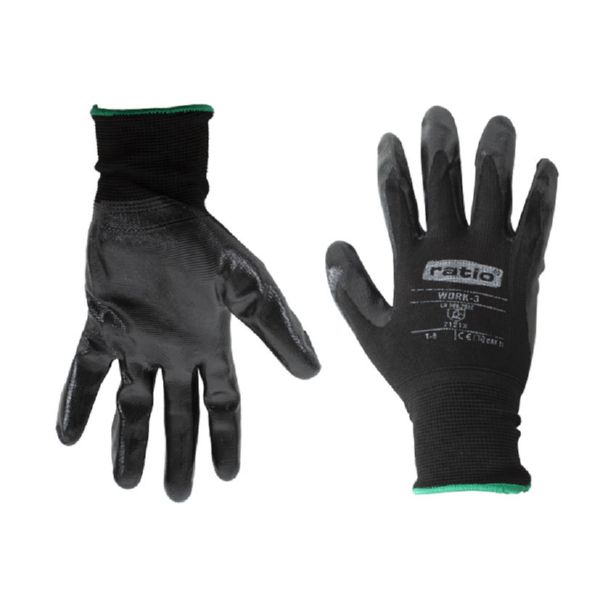 Nilón negro sin costuras, muy resistente con recubrimiento de nitrilo negro en palma, alta calidad. Galga 13. Puño elástico. El soporte sin costuras proporciona ergonomía y no provoca fatiga. Usos: agricultura, automoción, logística, mecánica, montaj Talla 8.