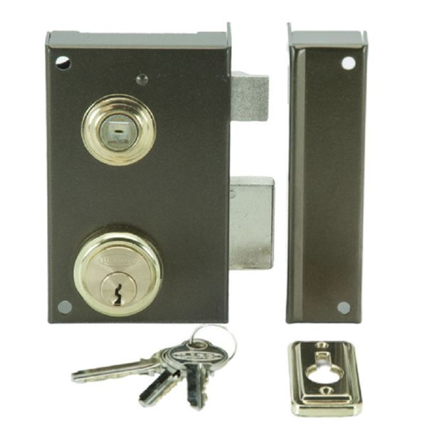 Cilindro accionado con llave por ambos lados. Picaporte accionado mediante manilla. Hierro esmaltado alta resistencia. Incluye 3 llaves. Cilindro pera. Entrada 43 mm. Izquierda 70 mm.