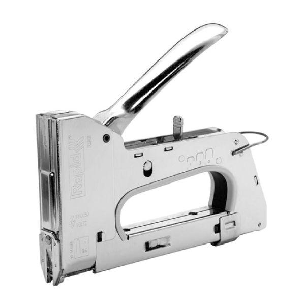 Carcasa y mecánica de acero. Para trabajos profesionales exigentes y operaciones de precisión. Especialmente diseñada para cables de baja tensión 50V hasta ø 6 mm tales como altavoces y cables de alarma. Regulador de fuerza patentado de 3 pasos. Dise Grapas 36. 10-14 mm...Peso: 820 gr...Cargador completo: 84 grapas.