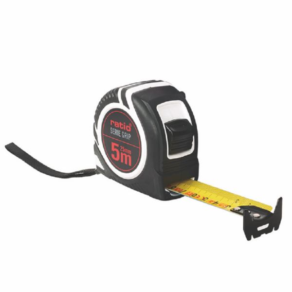 Carcasa ABS con recubrimiento antideslizante. Cinta numeración doble cara (amarilla/blanca) con revestimiento nilón antireflex. Gancho metálico doble reforzado y botón de bloqueo. Clip para cinturón y correa de mano. Homologado CE, clase de Precisión 5 metros. Cinta 25 mm. Film transparente en los primeros 24/27 cm.