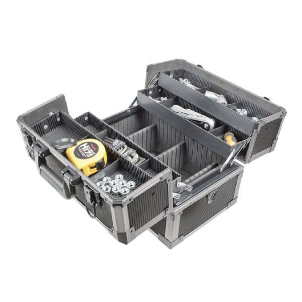 Estructura ligera PVC/Aluminio. Esquinas exteriores metálicas reforzadas. Cierres metálicos. Interior acolchado. Empuñaduras antideslicentes Portaherramientas cantilever Lightbox 6557-3. 36x22,6xh.25 cm. 4 bandejas apertura cantilever con separadores ajustables. 3 separadores ajustables para la caja inferior. 2 cierres metálicos con llave.