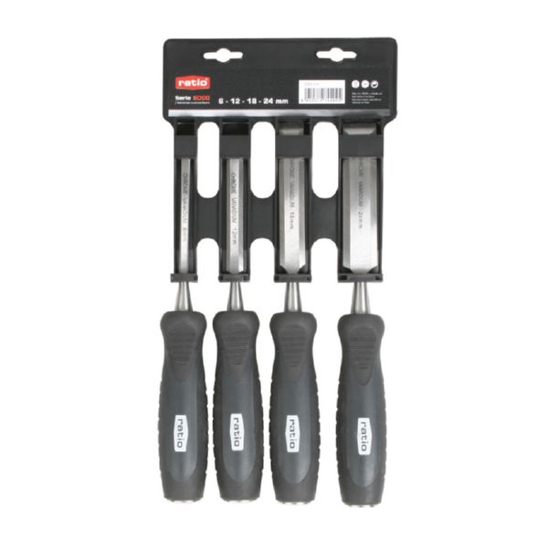 Acero cromo-vanadio forjado con tratamiento térmico, dureza 58-62HRC. Cantos biselados. Mango bimaterial antideslizante con cabezal metálico. Juego 4 formones. 6-12-18-24 mm.