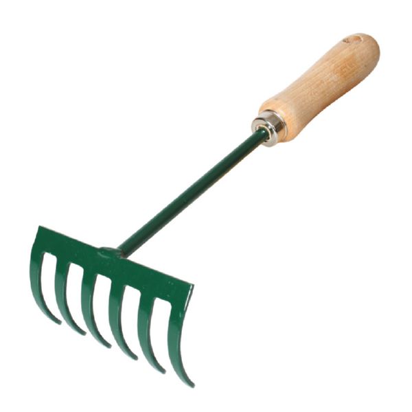 Acero alta calidad pintado epoxi. Mango madera barnizada fijado con virola metálica. 4. Rastrillo 6 dientes. 300 x 110 mm.