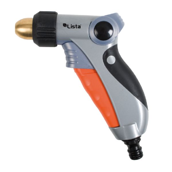Cuerpo metálico de gran resistencia. Regulador salida caudal de agua. Gatillo con sistema de bloqueo. Riego regulable desde chorro a lluvia fina.