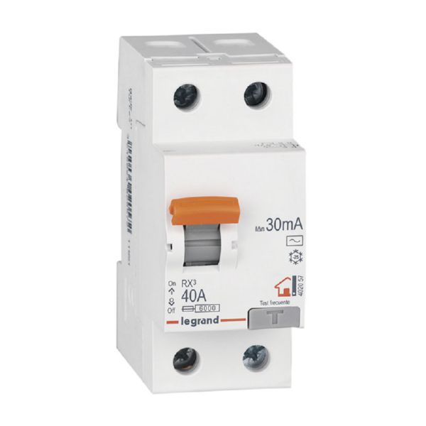 Dispositivo electromecánico que se coloca en las instalaciones eléctricas de corriente alterna, con el fin de proteger a las personas de las derivaciones causadas por faltas de aislamiento entre los conductores activos y tierra o masa de los aparatos 2P 40 A. 30 mA.