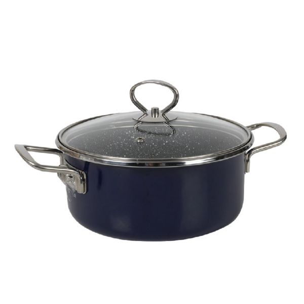 Cuerpo de acero esmaltado vitrificado en color azul cobalto. Mangos, asas y pomos de acero inoxidable. Apto para todo tipo de fuegos y apto también para lavavajillas. 100% inducción. Cacerola 24 cm.