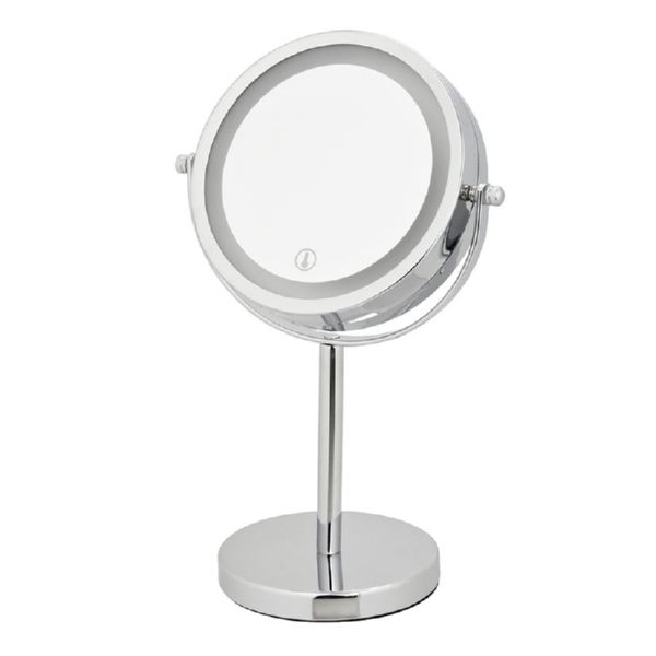 Metal cromado. Doble cara. Aumento x3. Encendido táctil. Funciona con 4 pilas AAA (no incluidas). ø 16xh.30 cm.