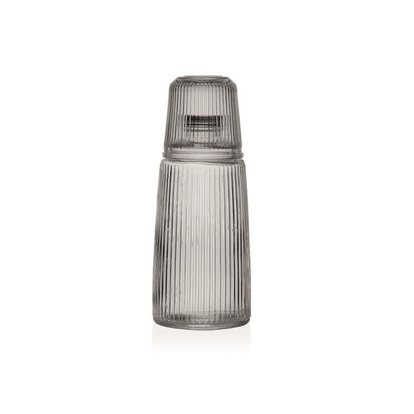 Set botella con vaso de cristal. Botella con capacidad de 1.100ml y tapón de aluminio. Vaso cristal con capacidad 250ml. Caja litografiada. 10,3x10,3x26 cm. 1,1 litro.