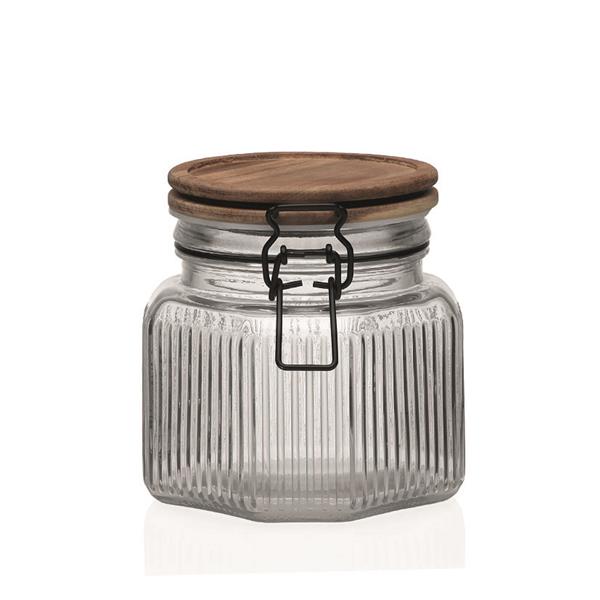 Bote cristal hermético acabado rayas con tapa en madera acacia. 800ml.
