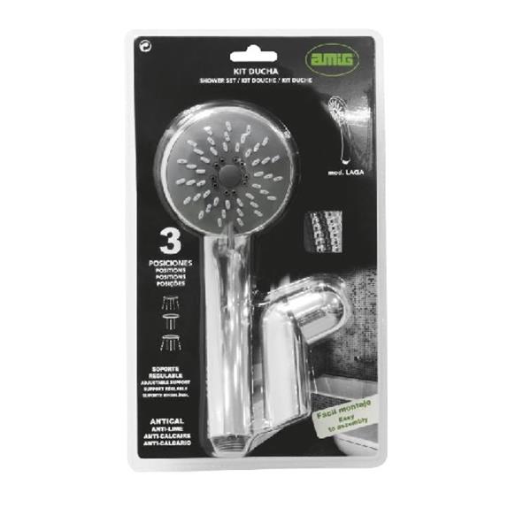 KIT DUCHA LAGA F3                                                      Teléfono ducha modelo Laga. Soporte regulable modelo 9914. Flexo ducha: 1,7 m. 3 posiciones.