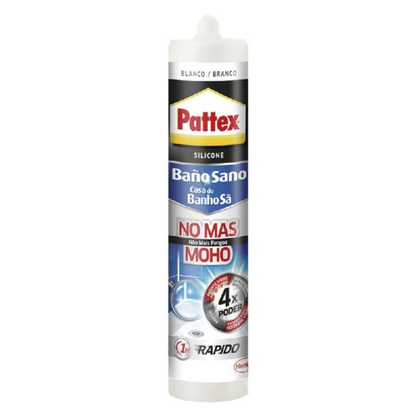 • "Pattex No más moho es una silicona sanitaria de primera calidad protegida contra el moho, para la realización de acabados y sellados de juntas en cuartos de baño.