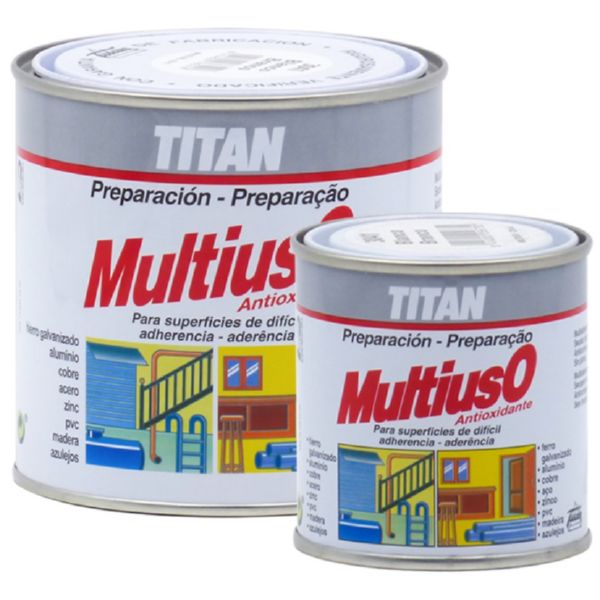 SUPERFICIES NO PREPARADAS: Acero: desoxidar utilizando cepillo de púas o lija. Desengrasar y eliminar el polvo y los residuos de óxido. Galvanizado, PVC, zinc, latón, aluminio, cobre y azulejos: limpiar con agua y detergente amoniacal. Lijando suavemente se mejora la adherencia. Aplicar 1 capa de preparación. En zonas húmedas, aplicar 2 manos de preparación. Madera: lijar la madera en sentido de las vetas, limpiar a fondo, eliminar resinas o secreciones de resina y matar cantos vivos. Aplicar 1 o 2 capas según absorción, lijando entre capas si se desea un acabado fino. En maderas a la intemperie, aplicar previamente Titanxyl Protección Total Ultra. Se pueden dar segundas capas de la imprimación o de esmaltes alquídicos pasadas 2 horas. Para acabados con productos de dos componentes epoxis y poliuretanos el acabado se debe llevar a cabo transcurridas 24 horas de la aplicación de la última capa de Preparación Multiuso TITAN. Interiores: aplicar 1 capa de Preparación Multiuso TITAN. Exteriores: aplicar 2 capa de Preparación Multiuso TITAN.