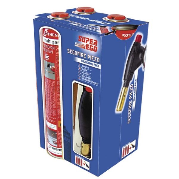 Encendido piezoeléctrico. Quemador Ø 22 mm con llama tipo dardo. Temperatura de trabajo 950ºC. Incluye 3 botellas Multigas 300.